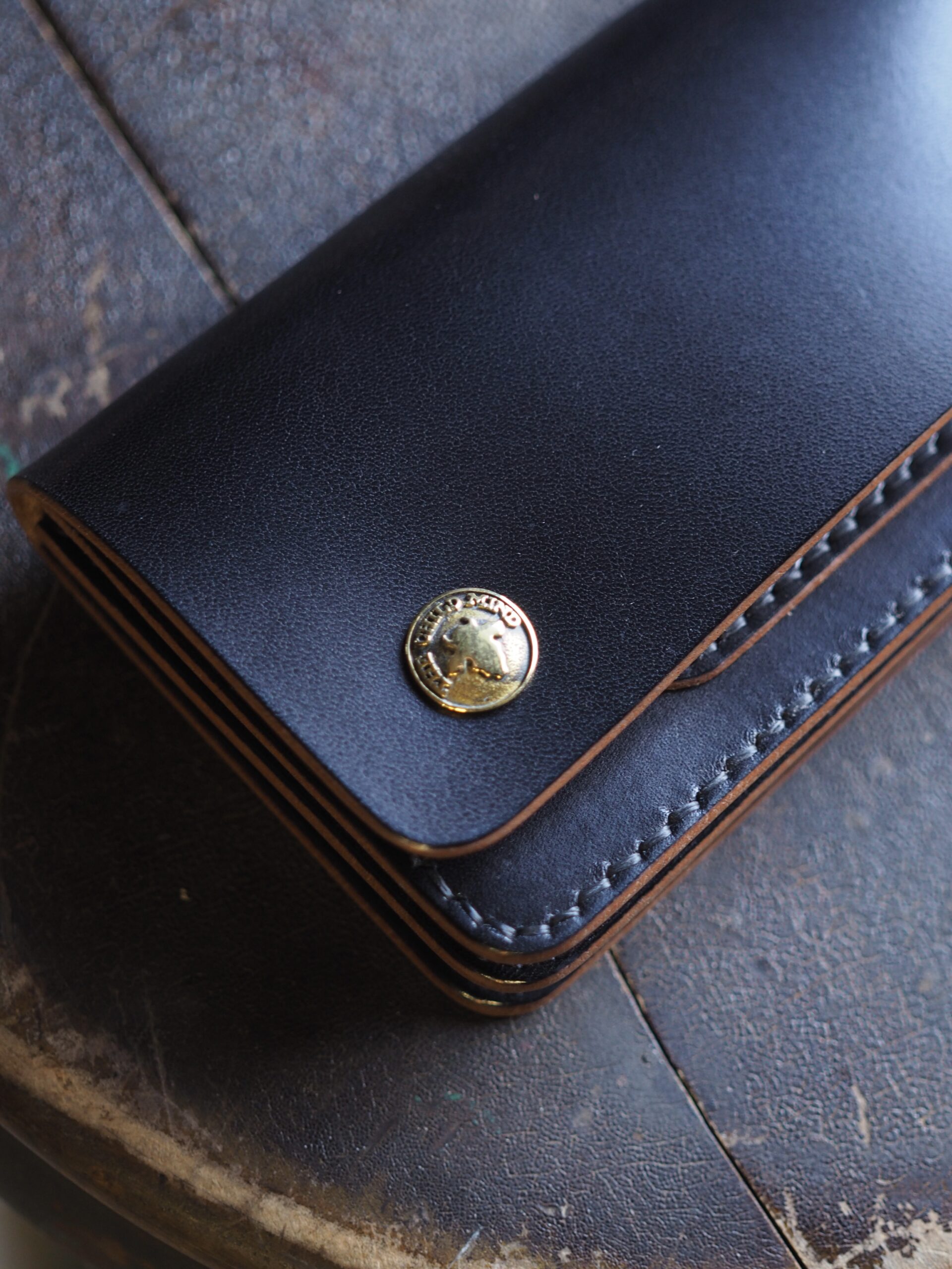 縫い目のないフラップ、少しだけ見えるカードケース、