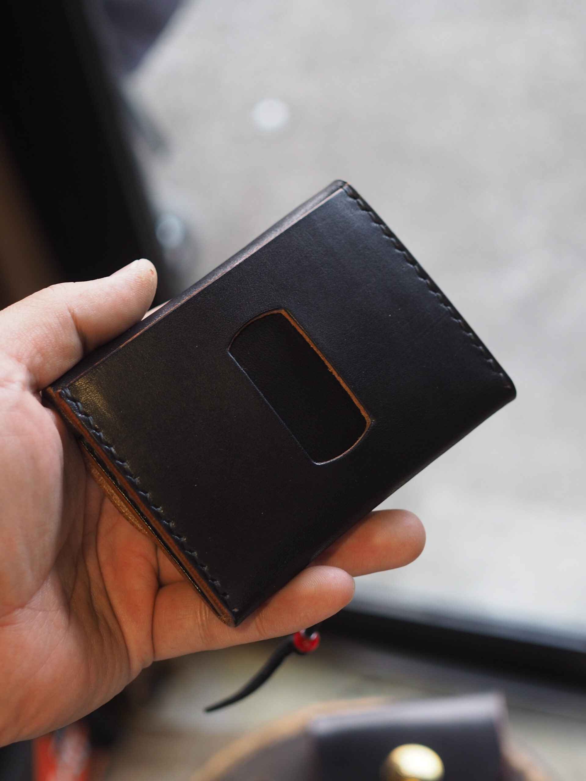 背面のカードケースは下部にステッチを入れない構造にすることで