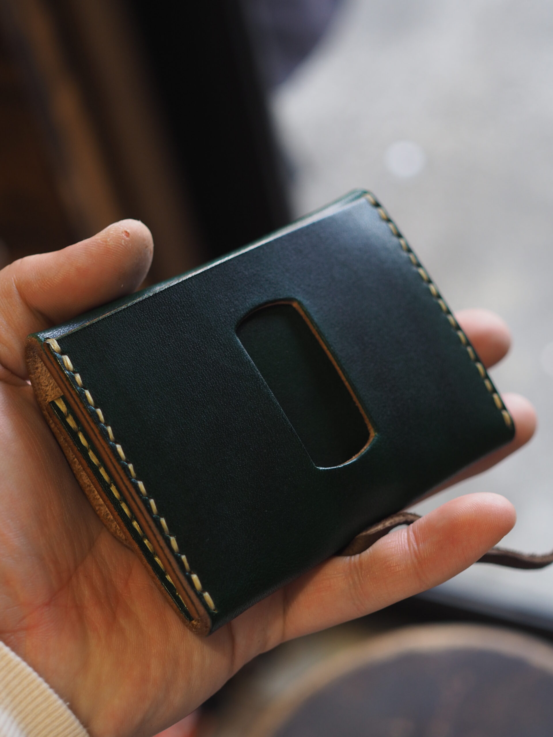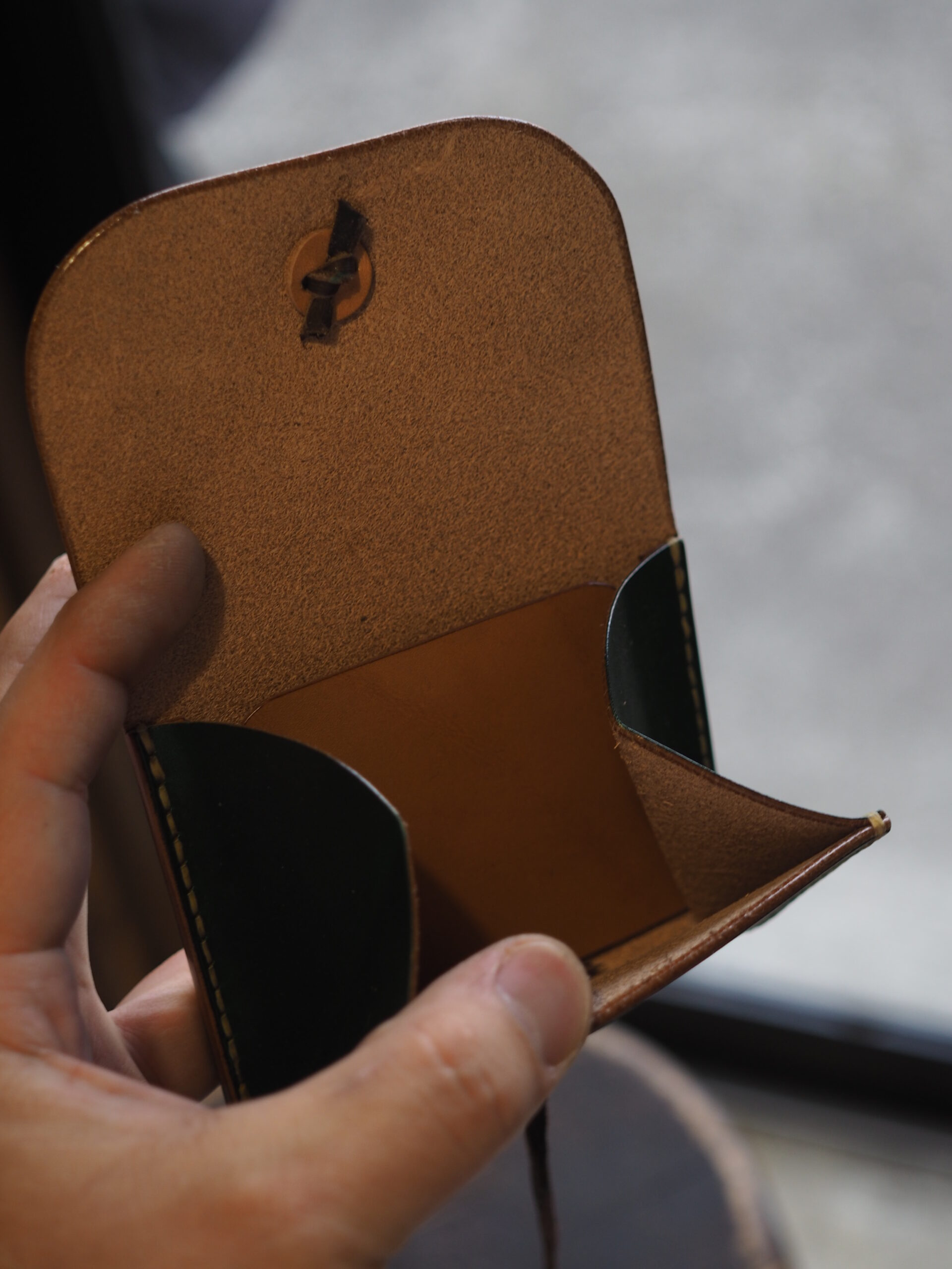 背面のカードケースは下部にステッチを入れない構造にすることで