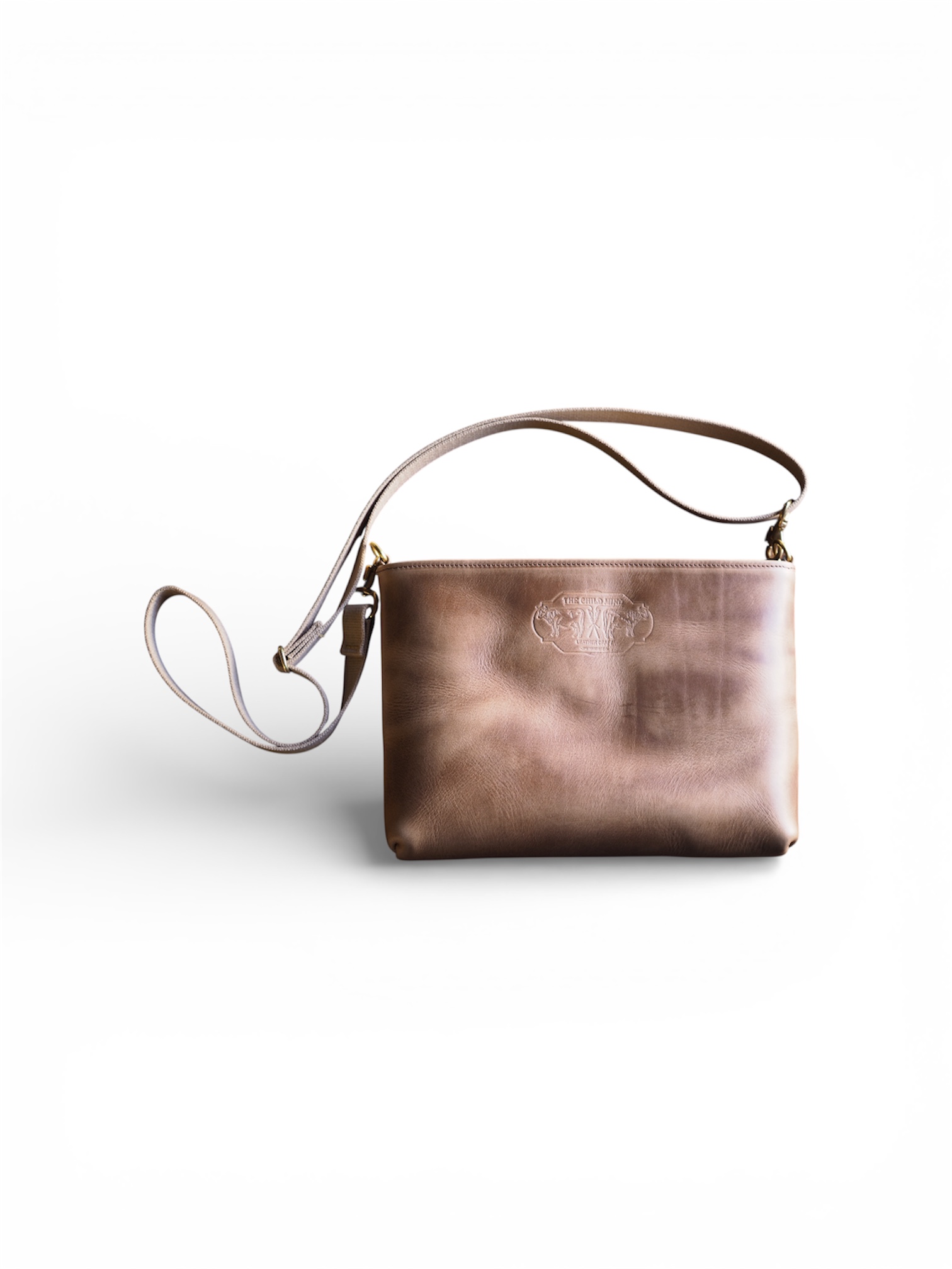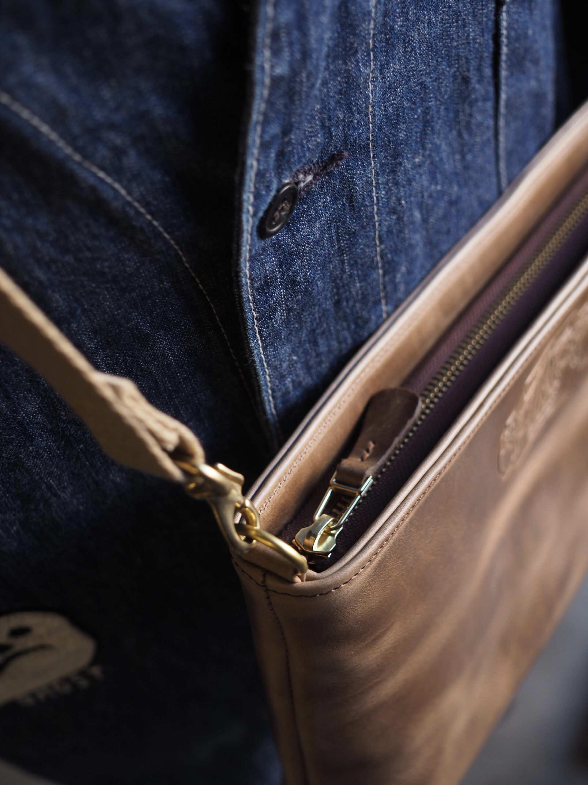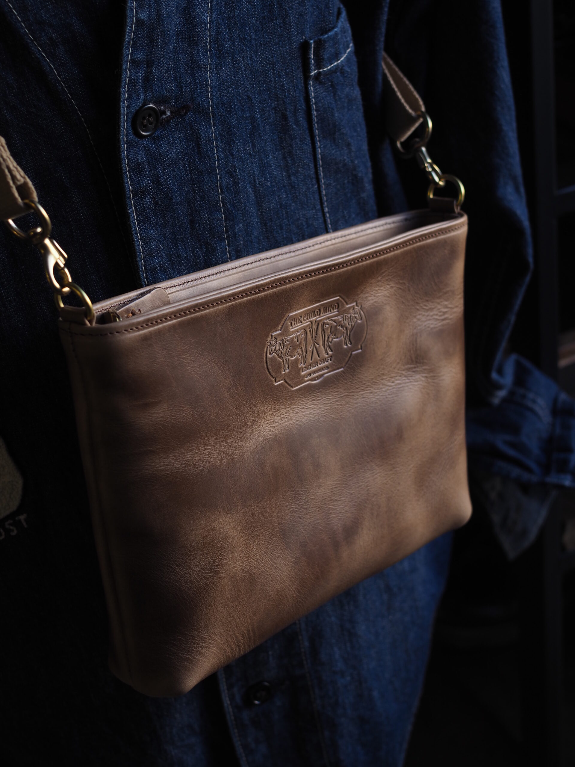 贅沢に使用したサコッシュ。 分厚くオイルを含んだレザーは、持つだけで存在感を放ち、