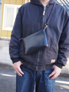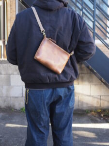 贅沢に使用したサコッシュ。 分厚くオイルを含んだレザーは、持つだけで存在感を放ち、